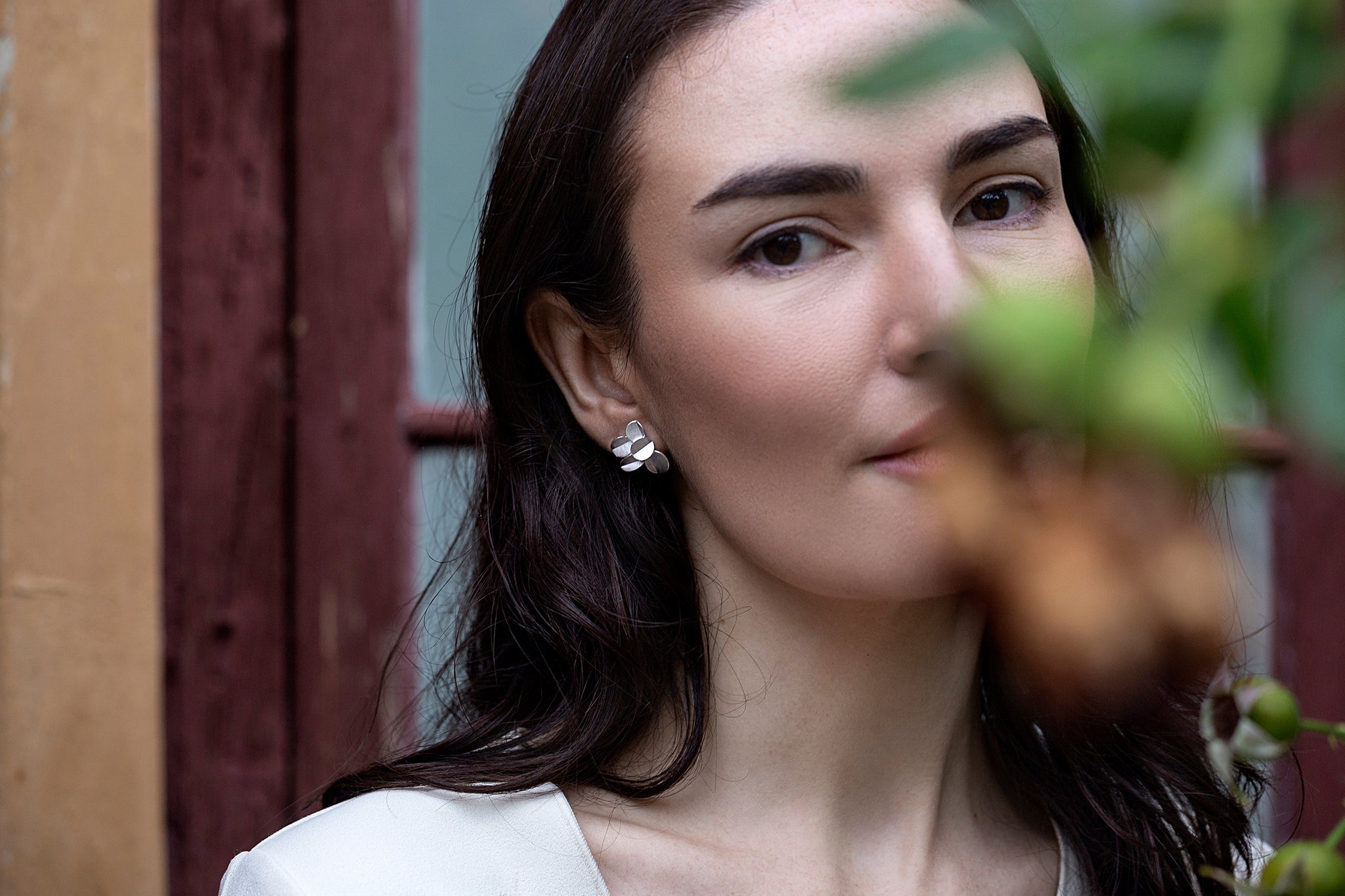 Glittertind medium stud earrings in silver sits nicely on the ear. They will always catch the light with the many angles of the circles.